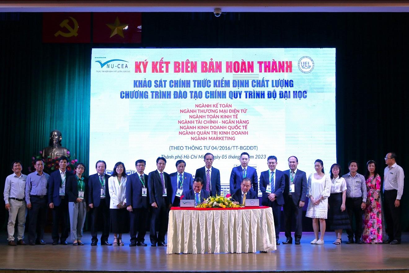 Kết thúc lễ bế mạc, đại diện Đoàn chuyên gia đánh giá ngoài và lãnh đạo Trường đã ký biên bản hoàn thành khảo sát chính thức 07 chương trình đào tạo của Trường Đại học Kinh tế - Luật.