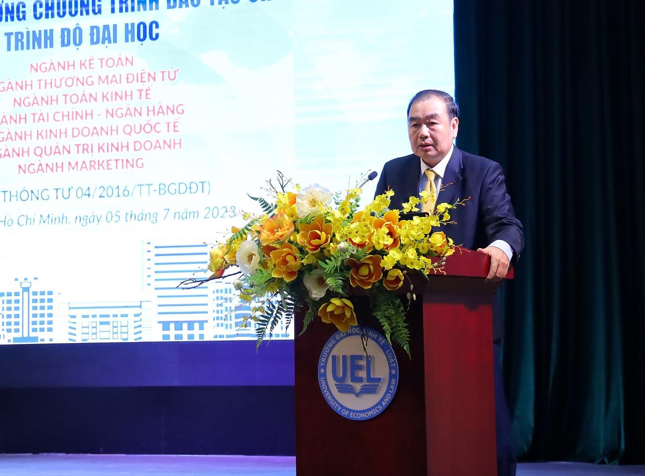 PGS.TS Lê Vũ Nam - Phó Hiệu trưởng UEL phát biểu tại lễ bế mạc khảo sát đánh giá ngoài 07 chương trình đào tạo tại UEL
