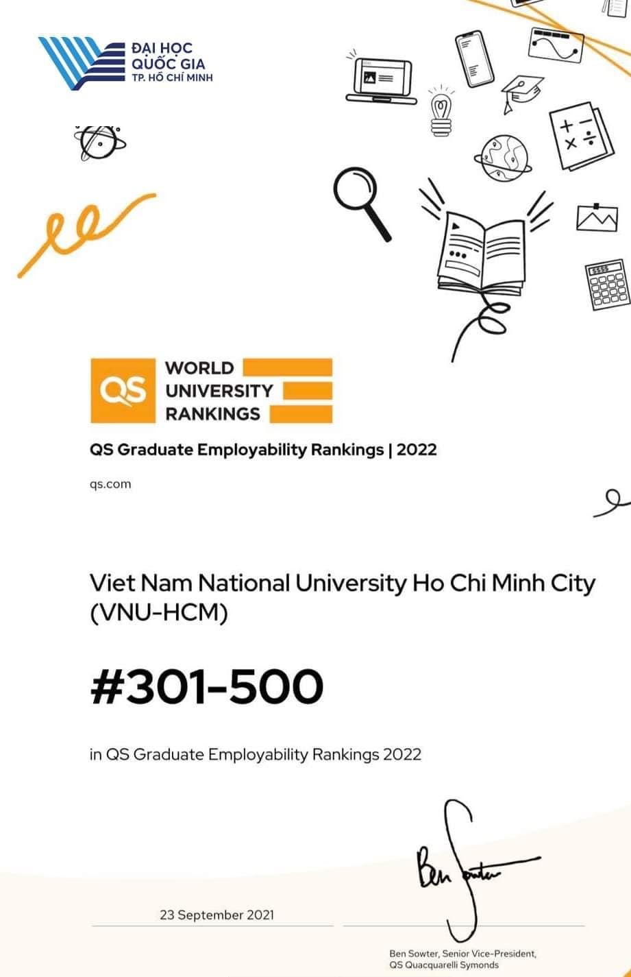 Theo đó, ĐHQG-HCM duy trì thứ hạng thuộc Top 301-500 trong 786 cơ sở giáo dục đại học hàng đầu đến từ 78 quốc gia do QS GER 2022 xếp hạng. Đây là năm thứ 4 liên tiếp ĐHQG-HCM xuất hiện trên bảng xếp hạng này.