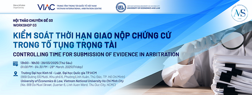 Hội thảo "Kiểm soát thời hạn giao nộp chứng cứ trong tố tụng trọng tài" được phối hợp tổ chức giữa Trường Đại học Kinh tế - Luật, ĐHQG-HCM và Trung tâm Trọng tài Quốc tế Việt Nam (VIAC) nhằm thảo luận về việc kiểm soát thời hạn giao nộp chứng cứ, qua đó góp phần nâng cao hiệu quả và tính minh bạch của quá trình tố tụng trọng tài.