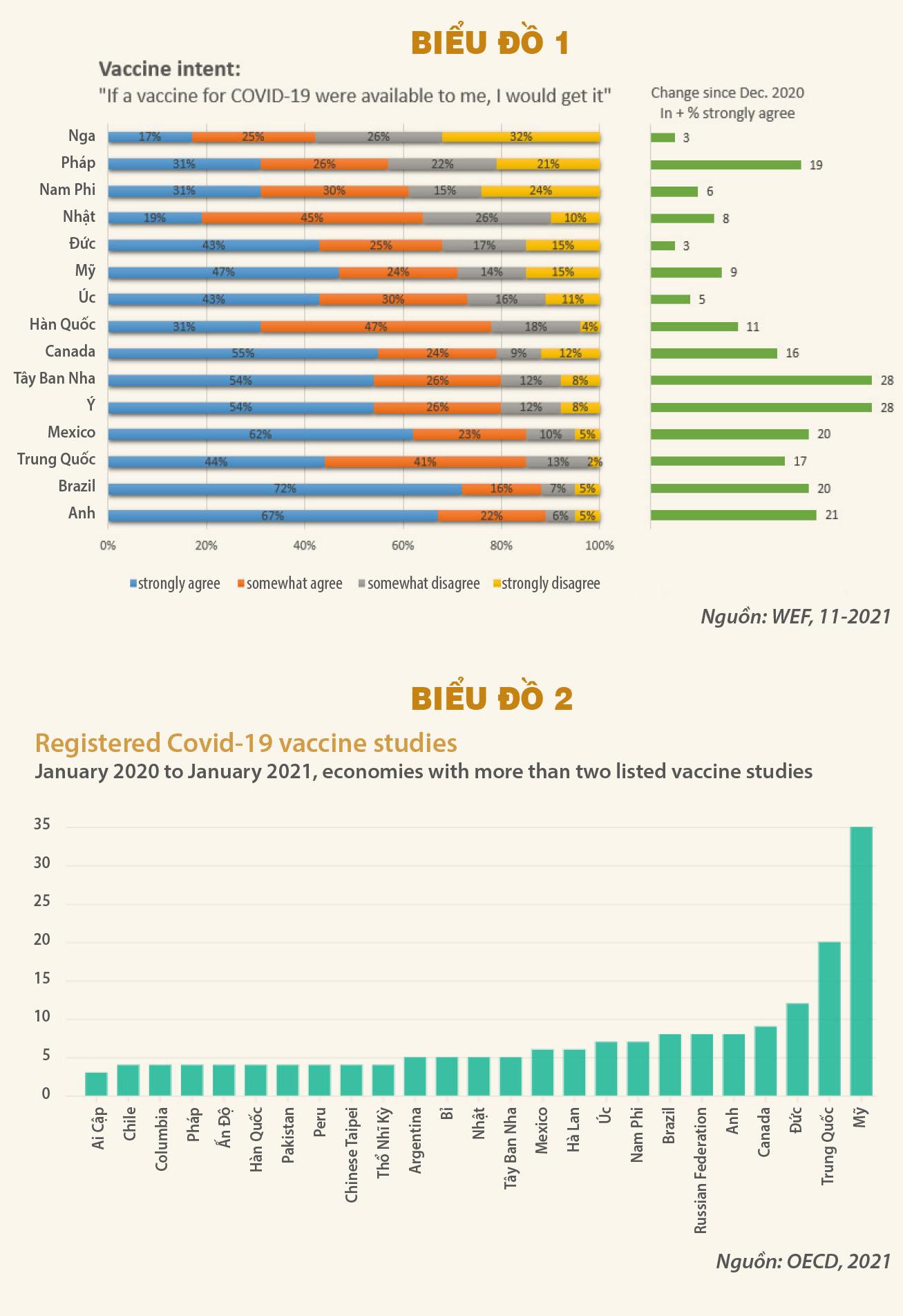 Thời gian gần đây, truyền thông phản ánh nhiều về lợi nhuận của các công ty nắm quyền sáng chế và sản xuất vaccine. Cũng giống như thành quả của bất kỳ hoạt động sáng tạo nào khác, ngoài việc nhìn vào chi phí, hãy nhìn vào rủi ro thất bại từ khi bắt đầu cho đến khi chưa có kết quả nghiên cứu thành công. Thống kê của OECD cho thấy, không ít quốc gia đã và đang xắn tay vào cuộc và số lượng nghiên cứu vaccine được đăng ký cũng không hề ít so với số lượng các vaccine đang được sản xuất và lưu hành trên thực tế hiện nay (biểu đồ 2). Ngay cả tại Việt Nam, vaccine Nanocovax qua nhiều nỗ lực vẫn chưa được Bộ Y tế cấp phép. Nghiên cứu đối với vaccine Covivac thì có lẽ cần thêm nhiều thời gian hơn.