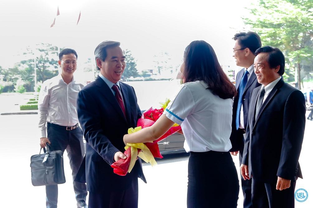 Sinh viên Trường ĐH Kinh tế - Luật, ĐHQG TP.HCM tặng hoa cho đồng chí Nguyễn Văn Bình