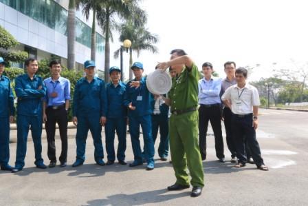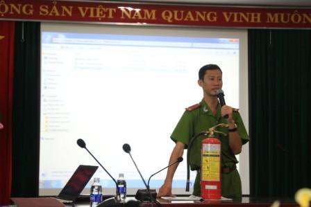 Cán bộ Cảnh sát PCCC đang tập huấn kiến thức về PCCC cho lực lượng PCCC UEL