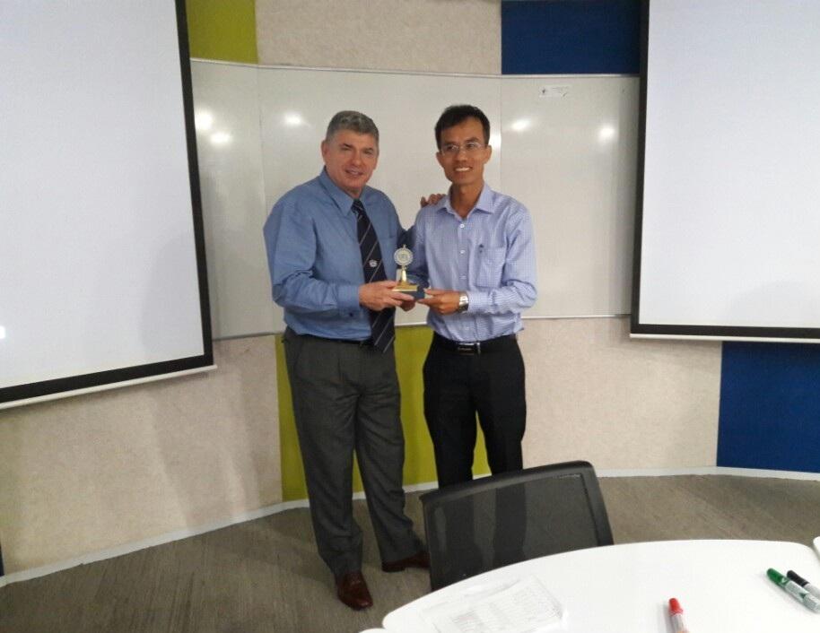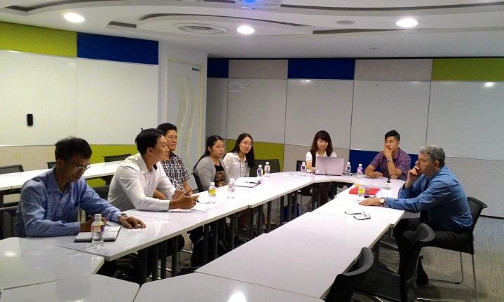 Trong chương trình làm việc, Đoàn đã có buổi trao đổi với Tiến sĩ Dennis Sale, người trực tiếp chủ trì hoạt động CDIO tại trường Singapore Polytechnic từ năm 2006 và có hơn 25 năm kinh nghiệm trong lĩnh vực giáo dục. Tiến sĩ Dennis Sale đã có những chia sẻ bổ ích về các vấn đề: khảo sát các bên có liên quan trong quá trình xây dựng chuẩn đầu ra và chương trình đào tạo, kinh nghiệm đánh giá các chuẩn đầu ra kỹ năng, kinh nghiệm triển khai giảng dạy với lớp đông, kinh nghiệm cải biên CDIO cho khối ngành phi kỹ thuật…