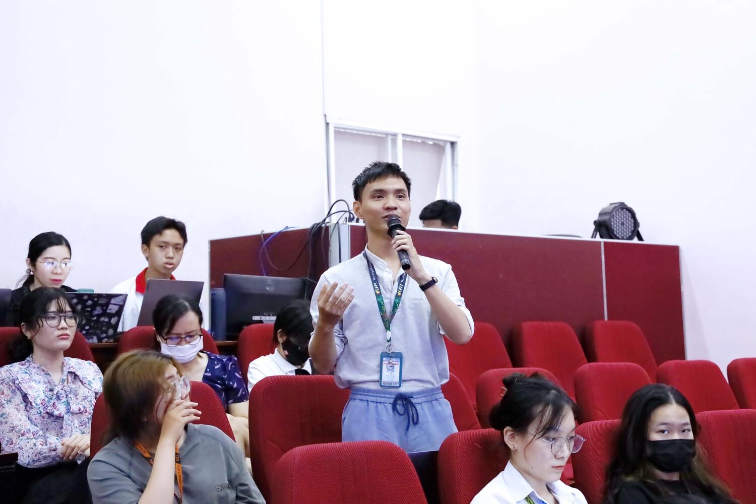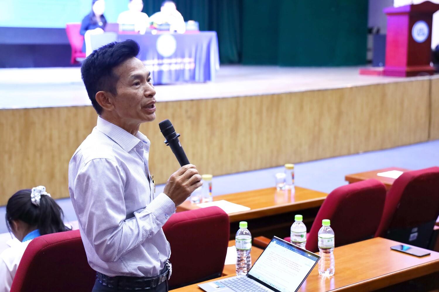 Tham gia ý kiến mở đầu, sinh viên Diệp Lê Phi Đỉnh (lớp K21407CA, khoa Quản trị kinh doanh) và sinh viên Nguyễn Thành Lộc (lớp K20410, khoa Quản trị kinh doanh) cùng kiến nghị Trường tăng thêm tài liệu tại Thư viện phục vụ người học, đặc biệt là tài liệu bằng tiếng Anh, tài liệu điện tử cho sinh viên chương trình chất lượng cao, chất lượng cao bằng tiếng Anh.
