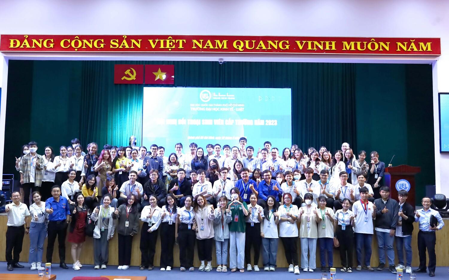 Ngày 29/3/2023, Trường Đại học Kinh tế - Luật đã tổ chức Hội nghị đối thoại sinh viên cấp Trường 2023. Đây là hoạt động thường niên để lãnh đạo Trường lắng nghe và giải đáp thắc mắc, tâm tư, nguyện vọng của sinh viên, đồng thời thông tin các chủ trương, định hướng phát triển quan trọng của nhà trường đến người học.