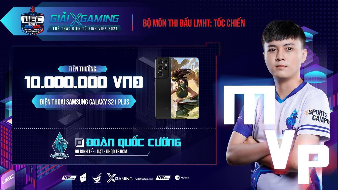 Thi đấu chói sáng xuyên suốt cả giải đấu, xạ thủ Đoàn Quốc Cường đến từ Trường Đại học Kinh Tế - Luật (ĐHQG-HCM) đã xuất sắc mang về cho mình danh hiệu Vận động viên xuất sắc nhất - MVP của Xgaming - UEC 2021 bộ môn Liên minh huyền thoại: Tốc Chiến.