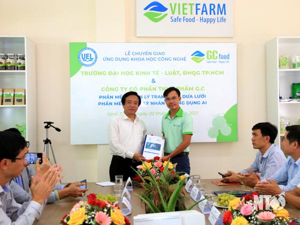 Song song đó, Trường Đại học Kinh tế - Luật còn chuyển giao phần mềm quản lý trang trại dưa lưới cho Công ty Cổ phần Nắng và Gió là các đơn vị thành viên GC Food. Qua đó khẳng định, GC Food là một trong những đơn vị tiên phong trong việc ứng dụng A.I vào trong sản xuất nông nghiệp hiện nay. Đây là hệ thống được thiết kế từ thực tế công việc làm vườn của nông dân, theo sát hoạt động của nông dân trong việc trồng dưa lưới. Hệ thống sẽ cho nông dân biết công việc cần làm trong ngày, từ đó có thể tối ưu được thời gian và năng suất công việc. Phần mềm giúp cho việc định lượng phân phù hợp; theo dõi phát hiện, phòng ngừa dịch bệnh cho cây trồng trong thời gian sớm nhất. Bên cạnh đó, phần mềm còn giúp cho việc thu hoạch dưa lưới và tưới tiêu đúng thời vụ, qua đó, giúp tăng tính cạnh tranh trên thị trường sản phẩm.