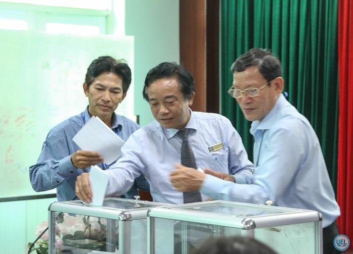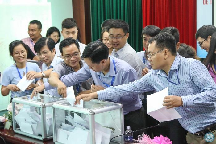 Các đại biểu bỏ phiếu ý kiến tín nhiệm để Đảng ủy - Ban Giám hiệu bổ nhiệm lại Phó Hiệu trưởng