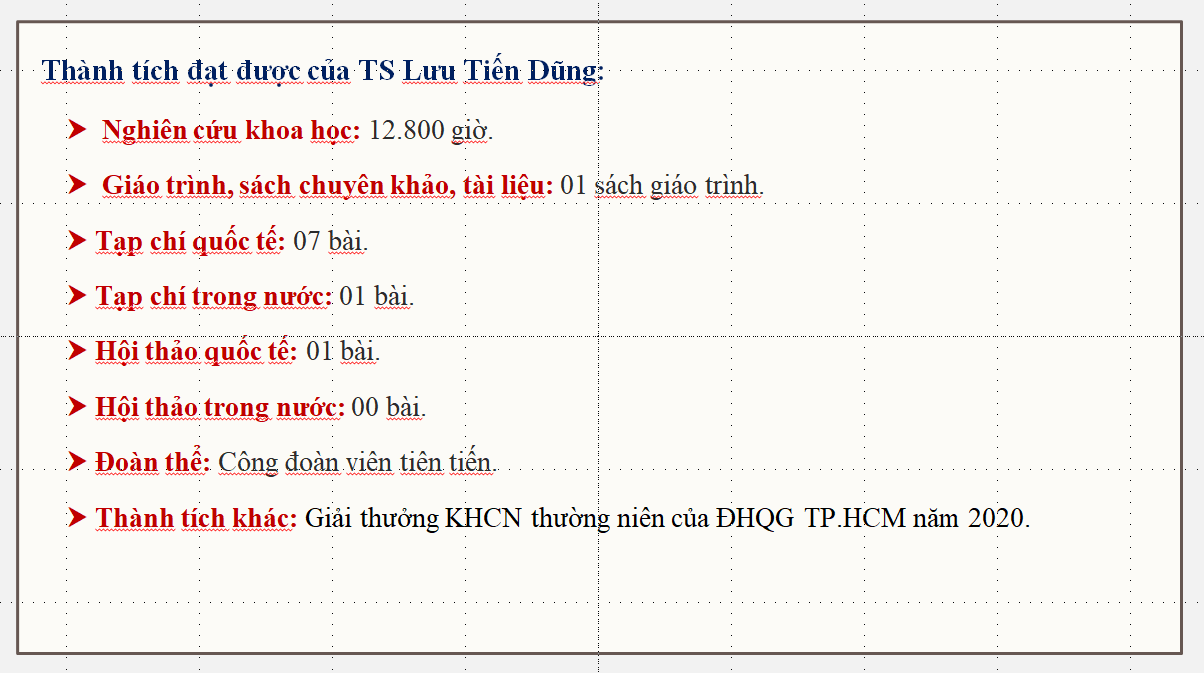 - Có 20 công bố trên tạp chí ISI, 6 công bố trên danh mục Scopus Q1; 28 công bố trên tạp chí Scopus Q2; 13 công bố trên tạp chí Scopus Q3 và 10 công bố trên tạp chí scopus Q4,...
