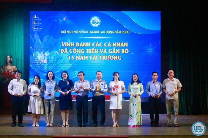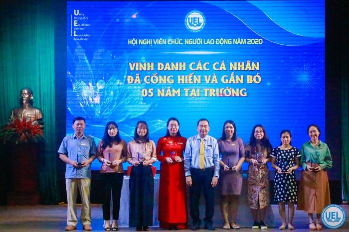 Tại Hội nghị, nhà trường đã vinh danh các tập thể và cá nhân xuất sắc nhận Huân Chương lao động hạng 3, cờ thi đua, danh hiệu, bằng khen của Bộ Giáo dục & Đào tạo, ĐHQG-HCM,cùng các cá nhân đã có quá trình công tác, cống hiến lâu dài cho Trường.