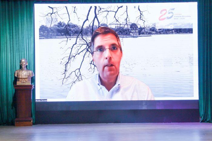 Ông Nicolas Dervaux, Đại diện Chính phủ Vùng Wallonie và Chính phủ Cộng đồng người Bỉ nói tiếng Pháp (Wallonie-Bruxelles) tại Việt Nam, đơn vị tài trợ chính cho Hội thảo phát biểu qua Video