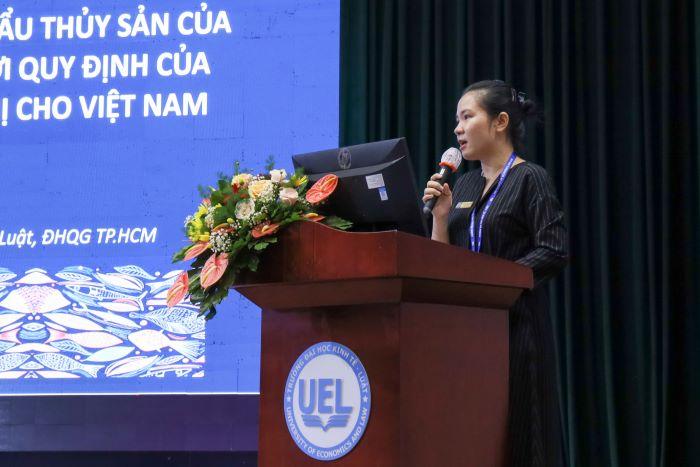 TS.Vũ Kim Hạnh Dung, Trường Đại học Kinh tế-Luật trình bày tham luận Chương trình giám sát nhập khẩu thuỷ sản của Hoa Kỳ dưới góc so sánh và một số khuyến nghị cho Việt Nam
