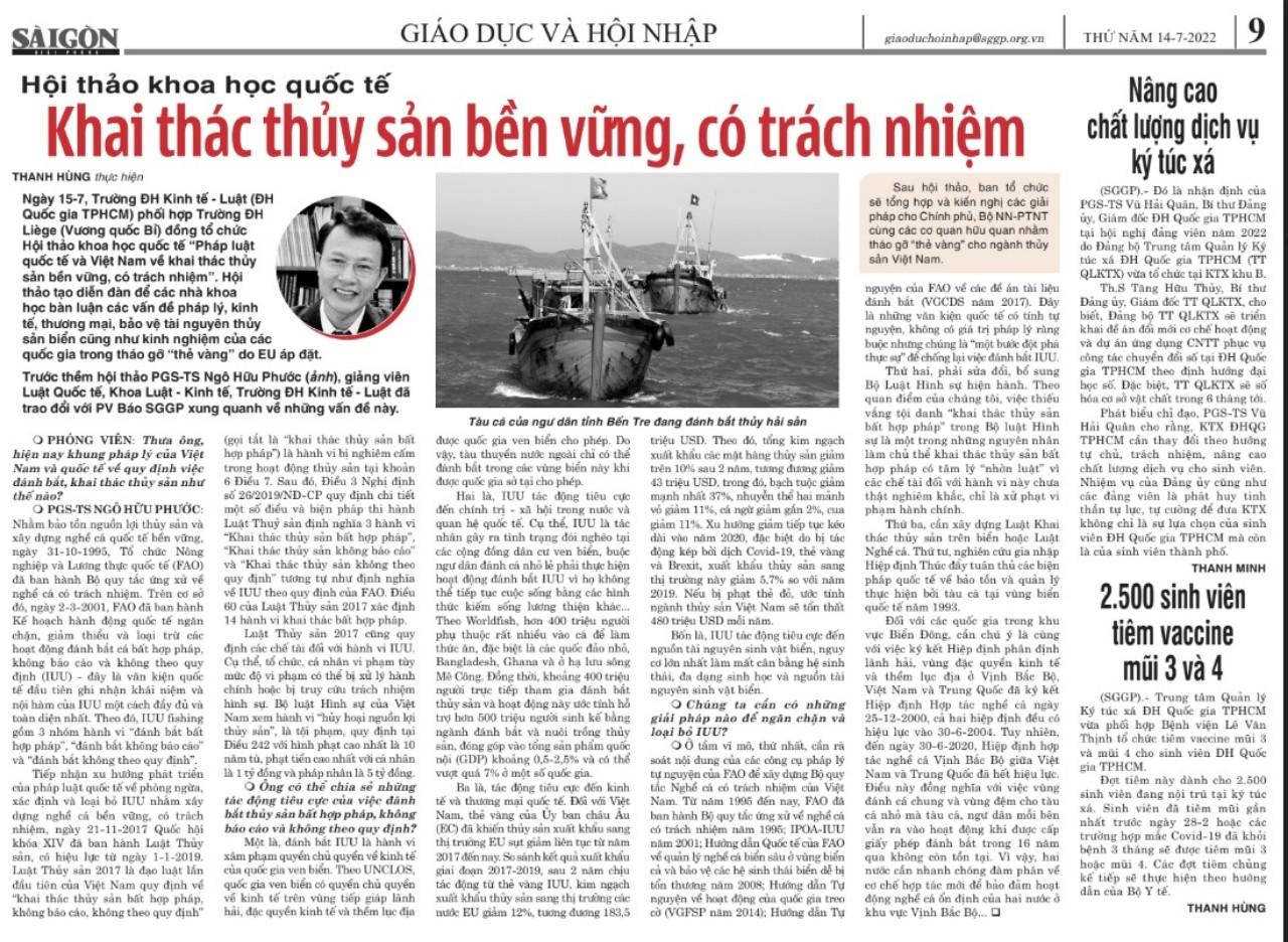 Ngày 15-7, Trường ĐH Kinh tế - Luật (ĐH Quốc gia TPHCM) phối hợp Trường ĐH Liège (Vương quốc Bỉ) đồng tổ chức Hội thảo khoa học quốc tế "Pháp luật quốc tế và Việt Nam về khai thác thủy sản bền vững, có trách nhiệm". Hội thảo tạo diễn đàn để các nhà khoa học bàn luận các vấn đề pháp lý, kinh tế, thương mại, bảo vệ tài nguyên thủy sản biển cũng như kinh nghiệm của các quốc gia trong tháo gỡ "thẻ vàng" do EU áp đặt.