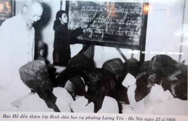 Bức ảnh Bác Hồ đến thăm lớp Bình dân học vụ phường Lương Yên (Hà Nội) năm 1956