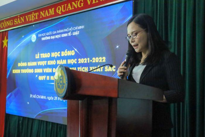 Phát biểu tại buổi lễ, PGS.TS Huỳnh Thị Thúy Giang chúc mừng các em sinh viên được nhận học bổng và vinh danh các em sinh viên đã đạt được nhiều thành tích xuất sắc trong hoạt động học thuật, nghiên cứu khoa học, văn thể mỹ. Và cô hy vọng học bổng sẽ giúp các em trang trải được một phần chi phí học tập và sinh hoạt, có thời gian tập trung học tập, rèn luyện, đạt được nhiều thành tích hơn trong thời gian tới.