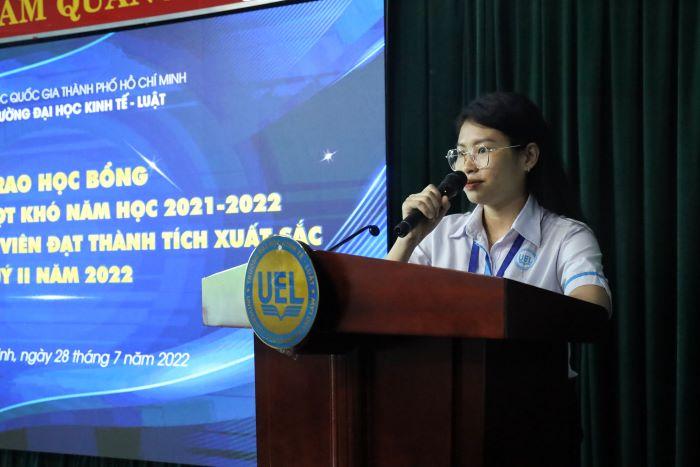 Nhằm kịp thời tuyên dương, động viên sinh viên đạt thành tích xuất sắc trong hoạt động học thuật, nghiên cứu khoa học, hoạt động văn thể mỹ; đồng thời trao học bổng cho sinh viên có hoàn cảnh khó khăn, UEL đã tổ chức Khen thưởng sinh viên đạt thành tích xuất sắc quý II/2022 và Lễ trao học bổng Đồng hành vượt khó năm học 2021-2022.