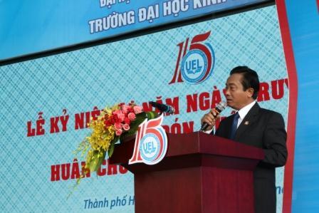 Tại buổi lễ chính, sau phần nghi thức và chiếu phim UEL 15 năm, PGS.TS Nguyễn Tiến Dũng, Bí thư đảng ủy, Hiệu trưởng Nhà Trường đã có bài phát biểu khai mạc sâu sắc.