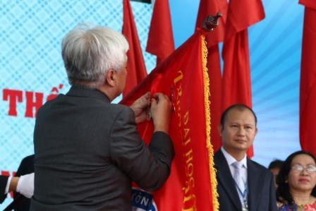 gắn Huân chương lao động hạng Hai lên lá cờ truyền thống UEL.