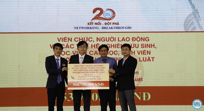 Tại buổi lễ, Ban tổ chức cũng đã dành một phút mặc niệm đến các nạn nhân trong đợt thiên tai, lũ lụt và sạt lở tại miền Trung vừa qua. Với 140.000.000 đồng vận động được từ sự chung tay đóng góp từ các cá nhân trong Trường, đại diện Công đoàn UEL đã trao số tiền này cho Công đoàn ĐHQG-HCM để hỗ trợ đồng bào ở miền Trung trong đợt này.