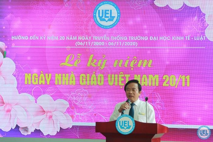 Phát biểu tại buổi lễ, PGS.TS. Nguyễn Tiến Dũng - Bí thư Đảng ủy, Hiệu trưởng Trường Đại học Kinh tế - Luật đã ôn lại truyền thống, ý nghĩa Ngày Nhà giáo Việt Nam và gửi lời chúc mừng đến tất cả các giảng viên, cán bộ viên chức Nhà trường đã và đang cống hiến cho sự nghiệp giáo dục, góp phần xây dựng nhà trường ngày càng phát triển.