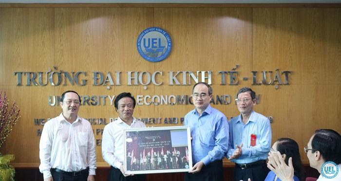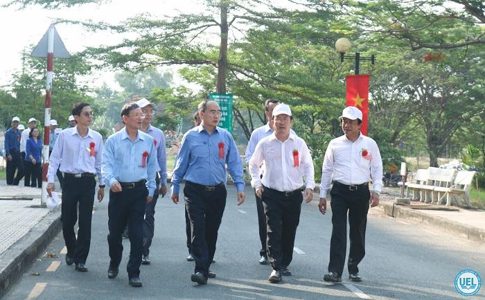 Sau khi kết thúc buổi lễ phát động "Tết trồng cây đời đời nhớ ơn Bác Hồ" và Tổng vệ sinh môi trường và phát triển mảng xanh năm 2020, ông Nguyễn Thiện Nhân, Ủy viên Bộ Chính trị, Bí thư Thành ủy TPHCM cùng các đại biểu, Ban Giám hiệu Trường Đại học Kinh tế - Luật, ĐHQG-HCM đã tham quan khuôn viên Trường.