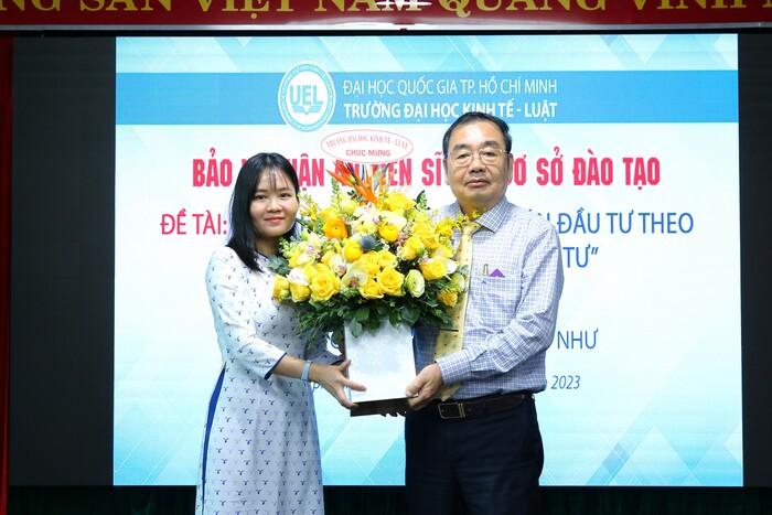 NCS Cao Thị Thùy Như nhận hoa chúc mừng từ PGS.TS Lê Vũ Nam - Chủ tịch hội đồng