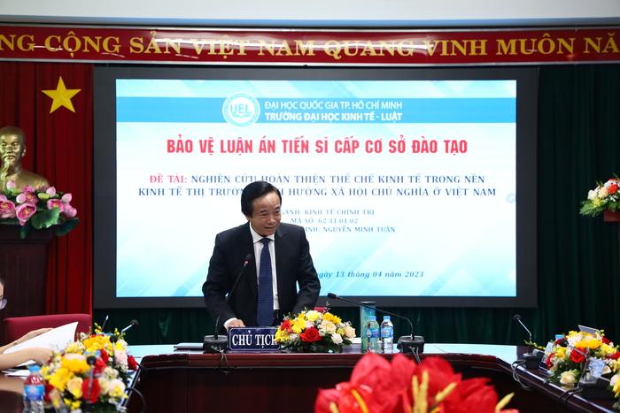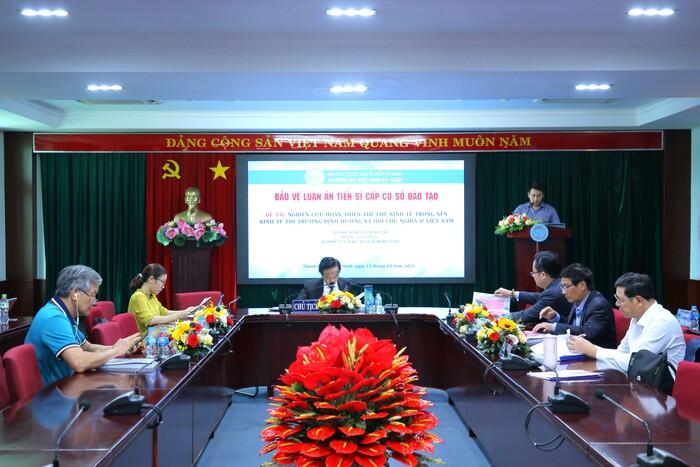 Hội đồng bảo vệ luận án tiến sĩ cấp cơ sở đào tạo của NCS Nguyễn Minh T uấn do PGS.TS Nguyễn Tiến Dũng làm Chủ tịch hội đồng. Trên cơ sở phân tích các lý thuyết về thể chế kinh tế cũng như dựa vào các đánh giá thực tiễn trong nền kinh tế Việt Nam. Luận án tập trung tìm ra những mặt còn hạn chế, yếu kém từ đó đưa ra các định hướng, giải pháp nhằm hoàn thiện thể chế kinh tế góp phần thúc đẩy nền kinh tế thị trường định hướng xã hội chủ nghĩa Việt Nam phát triển.