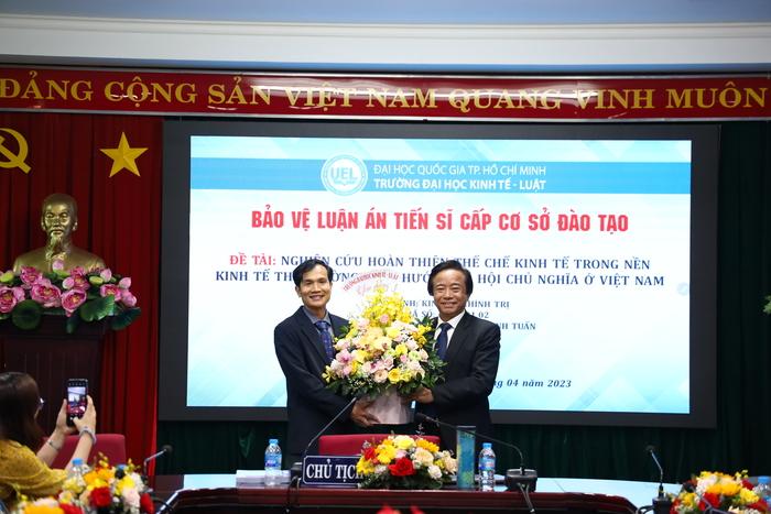 NCS Nguyễn Minh Tuấn nhận hoa chúc mừng từ PGS.TS Nguyễn Tiến Dũng - Chủ tịch hội đồng