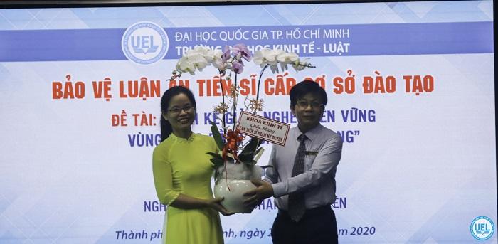 NCS Phạm Mỹ Duyên tặng hoa cảm ơn Hội đồng đánh giá luận án và giảng viên hướng dẫn