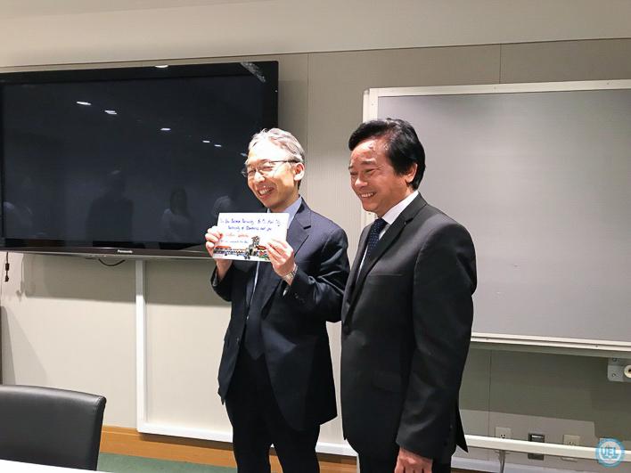 PGS. TS Nguyễn Tiến Dũng tặng quà lưu niệm cho GS. Yukihiro Ikeda, Trưởng khoa Kinh tế, Trường ĐH Keio