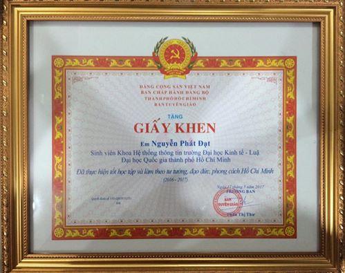 Sinh viên Nguyễn Phát Đạt nhận bằng khen của Thành ủy TP.HCM cá nhân thực hiện tốt học tập