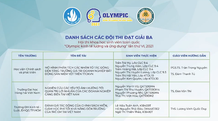 Giải ba của hội thi tiếp tục gọi tên UEL với đề tài "Đánh giá tác động của chính sách miễn giảm học phí tới khả năng đến Trường của trẻ em Việt Nam" do nhóm sinh viên Lê Hữu Tuấn Anh (lớp K18409T), Hồ Nguyễn Thái Bão (DH44IE002) và Ngô Thị Thiên Thảo (lớp K18410T) thực hiện dưới sự hỗ trợ của ThS Lương Vinh Quốc Duy.