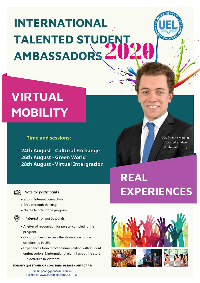Hàng năm, Trường Đại học Kinh tế - Luật (UEL) đều tổ chức chương trình giao lưu Sinh viên quốc tế tại Trường với sự tham gia của Đại diện Phòng Quan hệ đối ngoại các trường đại học quốc tế, Sinh viên quốc tế từ nhiều quốc gia và Sinh viên của UEL. Năm 2020, do ảnh hưởng của dịch bệnh, UEL chuyển chương trình giao lưu trực tiếp thành giao lưu online với chủ đề "Tập huấn Đại sứ Sinh viên Quốc tế Tài năng 2020 - Dịch chuyển ảo"