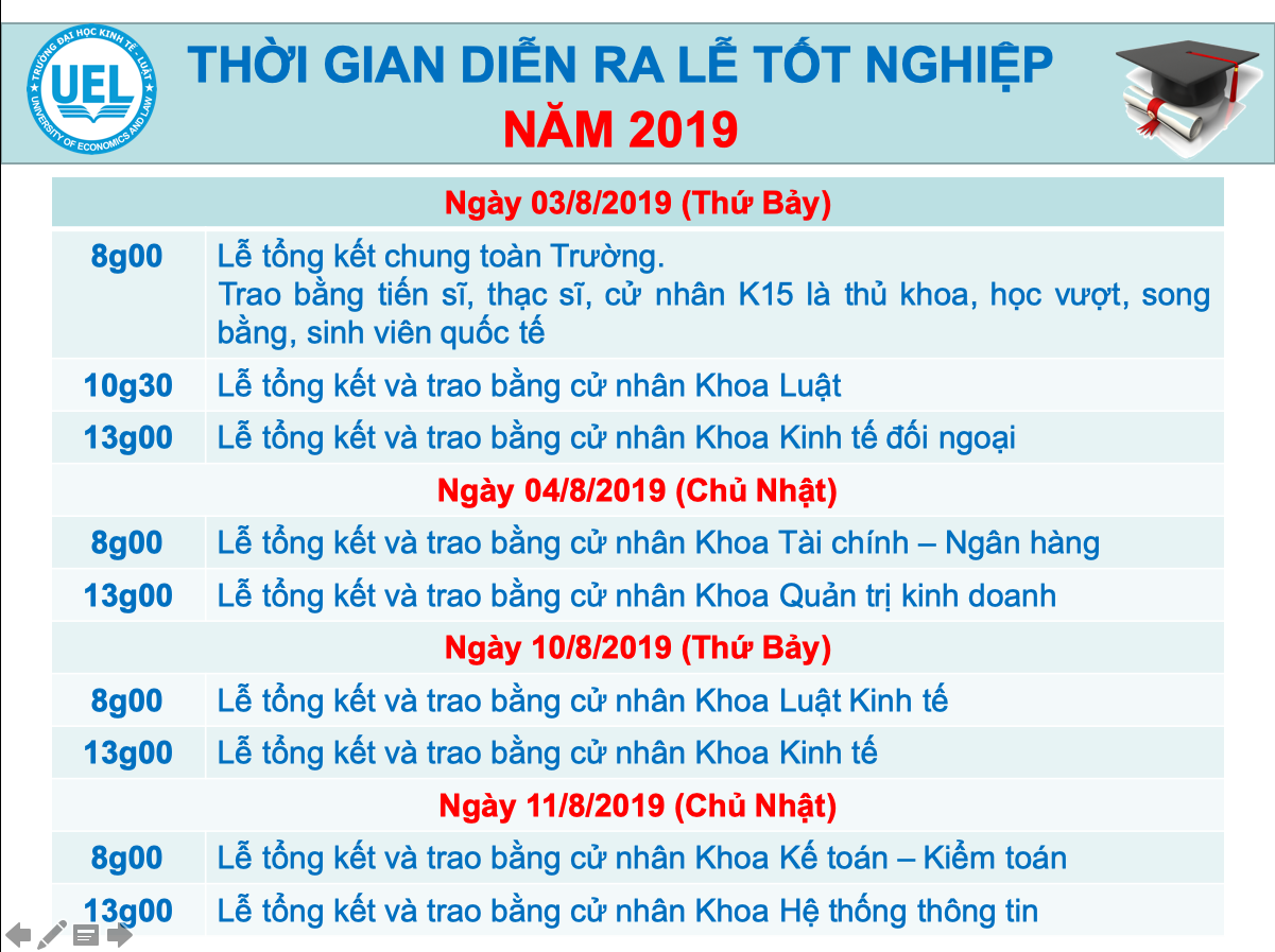 3.1 Đối với sinh viên tốt nghiệp là thủ khoa ngành, sinh viên quốc tế (Lào), sinh viên học vượt, học song bằng có mặt để tham dự Lễ tổng kết chung toàn Trường vào lúc 8g00 ngày 03/8/2019 và sẽ được khen thưởng, trao bằng tốt nghiệp tại buổi Lễ.