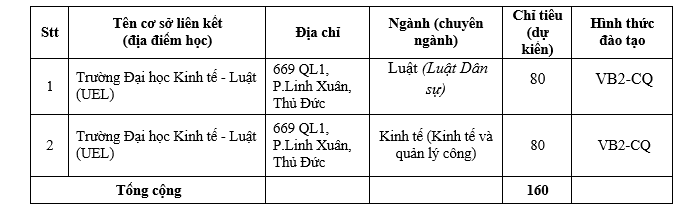 Trường Đại học Kinh tế - Luật, ĐHQG-HCM thông báo tuyển sinh đại học Văn bằng hai hình thức đào tạo chính quy (VB2 CQ), hình thức đào tạo vừa làm vừa học (VB2 VLVH) và tuyển sinh Vừa làm vừa học trình độ đại học ngành Luật, ngành Kinh tế năm 2020 như sau: