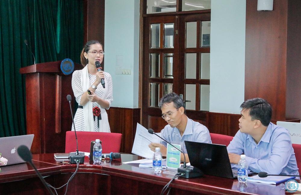 Cô Nguyễn Hải Trường An - Giám đốc Trung tâm Truyền thông và Tư vấn tuyển sinh trình bày tham luận "Hành trình truyền thông marketing trong tư vấn tuyển sinh tại Trường ĐH Kinh tế - Luật năm 2017"