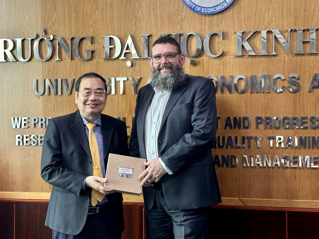 PGS.TS Lê Vũ Nam - Phó Hiệu trưởng UEL tặng quà lưu niệm cho ông Peter Francis - Phó Hiệu trưởng BCU