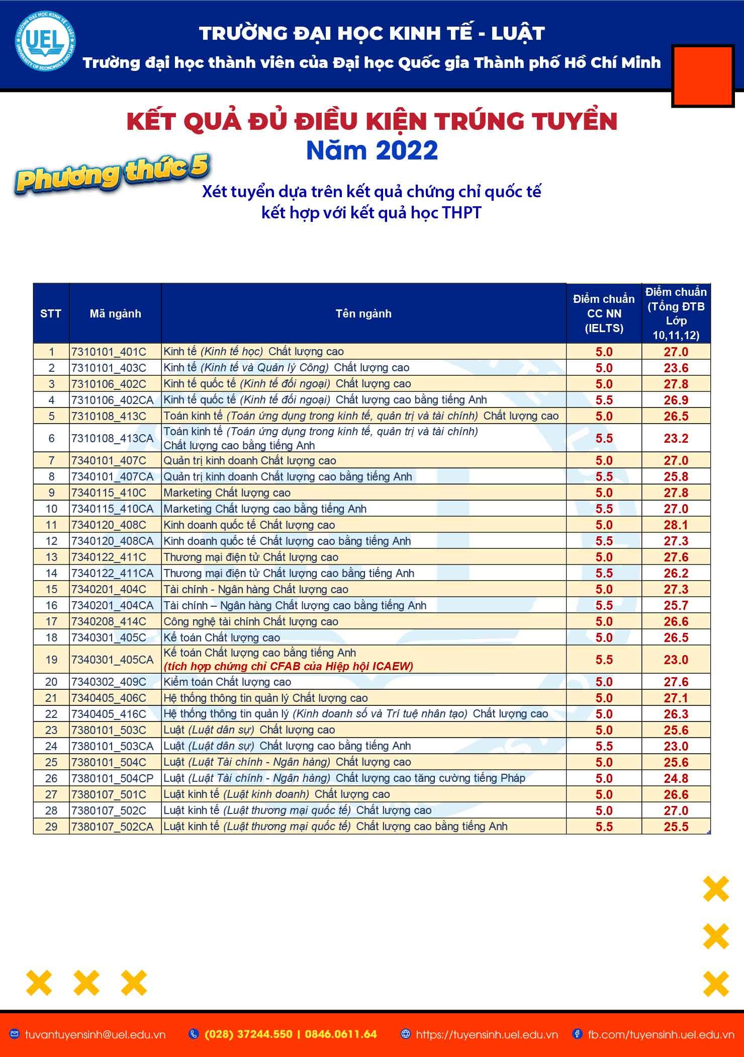 Phương thức 5: Xét tuyển dựa trên kết quả chứng chỉ quốc tế (IELTS, TOEFL, SAT, ACT, DELF,…) kết hợp với kết quả học bạ THPT đối với học sinh Việt Nam và học sinh có quốc tịch nước ngoài (học chương trình THPT quốc tế bằng tiếng Anh hoặc chương trình THPT trong nước). Đây là năm thứ tư UEL xét tuyển phương thức này với tối đa 20% tổng chỉ tiêu của các chương trình Chất lượng cao và không quá 50% tổng chỉ tiêu của các Chất lượng cao tăng cường tiếng Pháp, Chất lượng cao bằng tiếng Anh. Ở phương thức này nhà trường nhận được 1195 hồ sơ đăng ký xét tuyển với 3088 nguyện vọng xét tuyển. Chứng chỉ quốc tế cao nhất ở phương thức này là chứng chỉ IELTS 8.0, SAT 1480 và DELF B2 57,5. Đặc biệt, số hồ sơ có chứng chỉ IELTS 6.5 trở lên nộp vào Trường chiếm 48,2% tổng số lượng hồ sơ xét tuyển. Để xét tuyển bằng phương thức này thí sinh cần có chứng chỉ IELTS từ 5.0 trở lên và tổng điểm trung bình học tập trung học phổ thông trong 3 năm từ 21 điểm trở lên.