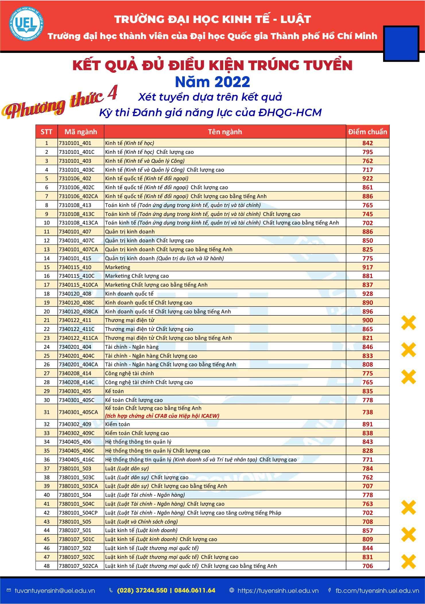 Phương thức 4 là xét tuyển dựa trên kết quả Kỳ thi Đánh giá năng lực (ĐGNL) năm 2022 của ĐHQG-HCM có 29.115 hồ sơ đăng ký xét tuyển với 55.889 nguyện vọng. Kỳ thi ĐGNL của ĐHQG-HCM năm 2022 được tổ chức thành 02 đợt thi và UEL xét tuyển cả 02 đợt thi. Điểm trung bình năm 2022 là 853 (tính theo thí sinh đủ điều kiện trúng tuyển), trong đó, điểm trung bình khối ngành Kinh tế là 843 điểm, khối ngành Kinh doanh & quản lý là 872 điểm và khối ngành Luật là 819 điểm. Năm nay, thí sinh TRẦN GIA CƯỜNG (Trường THPT Chuyên Trần Hưng Đạo - Tỉnh Bình Thuận) với điểm thi 1046 điểm đủ điều kiện trúng tuyển vào chương trình Kinh tế đối ngoại Chất lượng cao, là thí sinh cao điểm nhất ở phương thức này. Trường THCS và THPT Nguyễn Khuyến (TP.HCM), Trường THCS-THPT Nguyễn Khuyến (Bình Dương), Trường THPT Trần Phú (TP.HCM), Trường THPT Gia Định (TP.HCM) và Trường THPT Nguyễn Thượng Hiền (TP.HCM) là 05 trường THPT có số thí sinh trúng tuyển phương thức này nhiều nhất vào UEL.