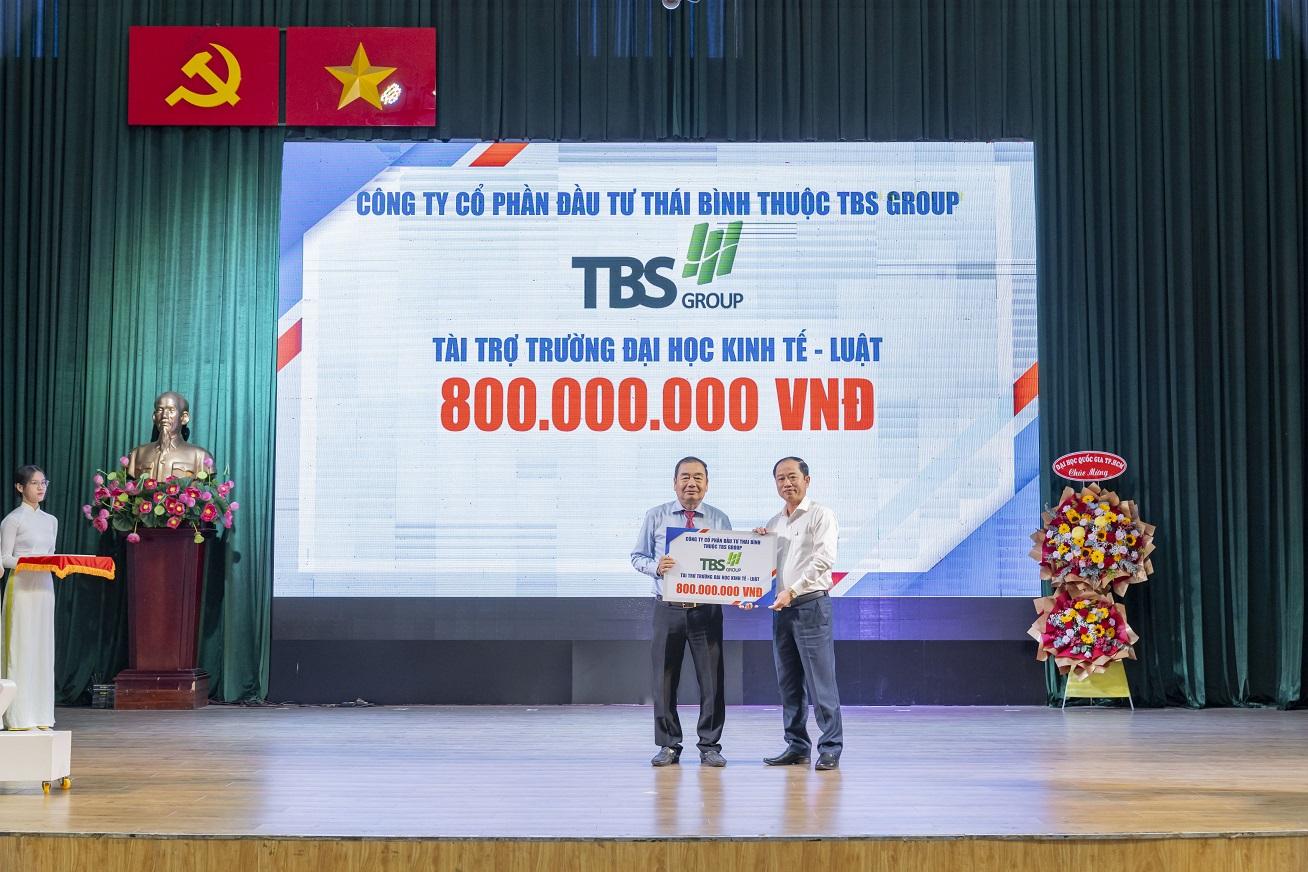 PGS.TS Lê Vũ Nam - Phó Hiệu trưởng Trường nhận tài trợ từ Ông Nguyễn Anh Tuấn - Phó Tổng Giám đốc Công ty CP đầu tư Thái Bình - TBS Group