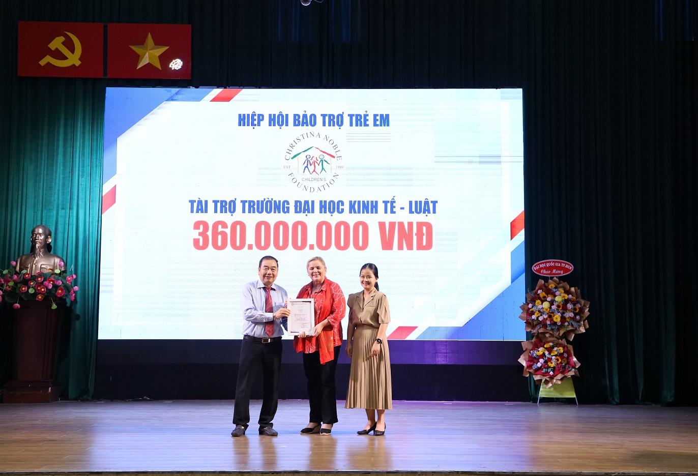 PGS.TS Lê Vũ Nam - Phó Hiệu trưởng Trường trao thư cảm ơn tài trợ cho Bà Helenita Noble - Giám đốc điều hành Hiệp hội Bảo trợ Trẻ em Christina Noble