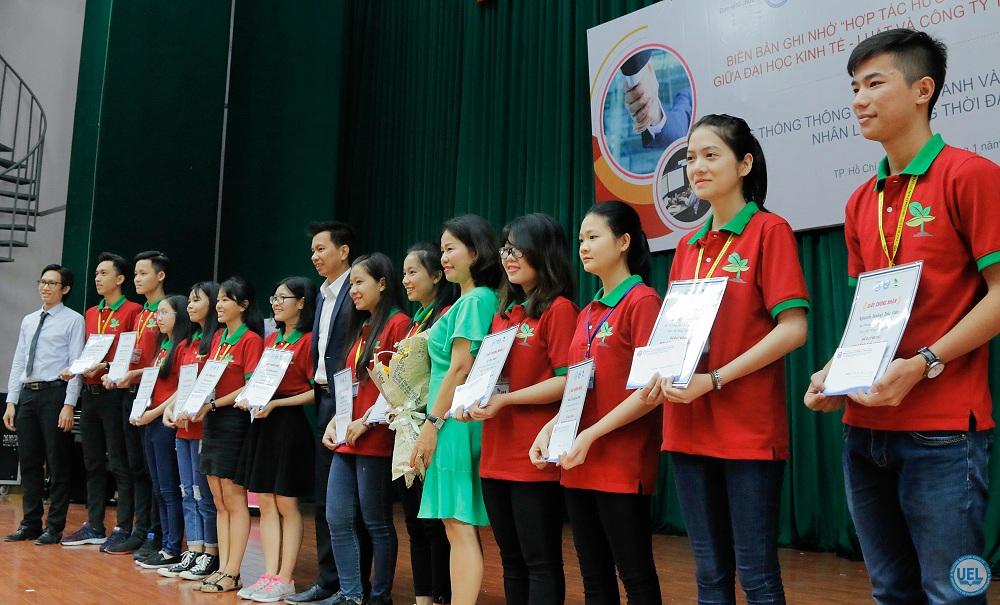 Quỹ Nhân bản (Khoa Hệ thống thông tin, Trường Đại học Kinh tế- Luật) trao học bổng cho sinh viên