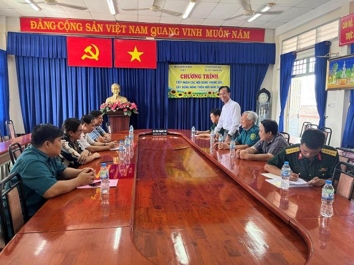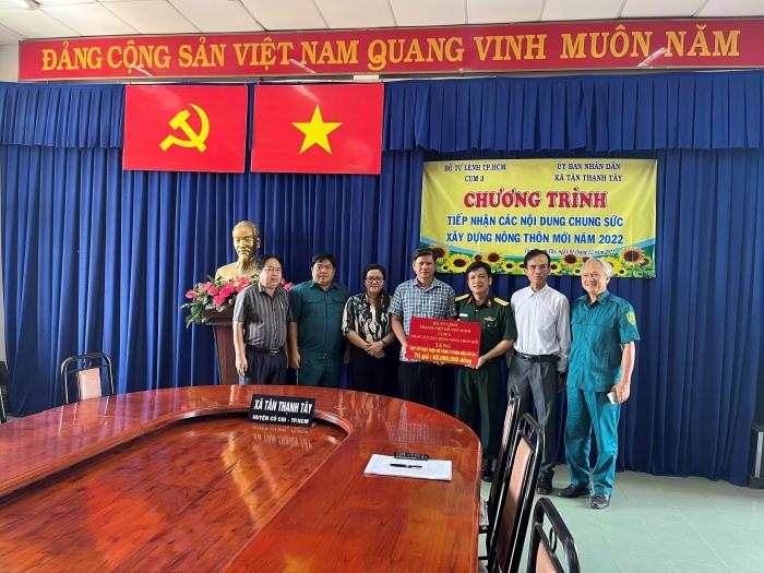 Đại diện lãnh đạo Tân Thạnh Tây, huyện Củ Chi tiếp nhận nguồn kinh phí từ các đơn vị BCHQS Cụm 3 tham gia xây dựng nông thôn mới năm 2022