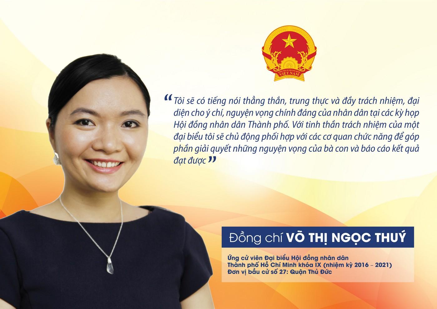 TS Võ Thị Ngọc Thúy hiện đang là Trưởng Bộ môn Marketing (Khoa Quản trị Kinh doanh, Trường ĐH Kinh tế - Luật) ứng cử viên Hội đồng nhân dân TP.HCM khóa IX (nhiệm kỳ 2016 - 2021) tại đơn vị bầu cử số 27 - Quận Thủ Đức.