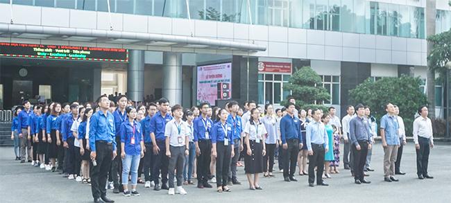 Ảnh: Quý vị đại biểu, quý thầy cô cùng các bạn Đoàn viên thanh niên chào cờ đầu tuần