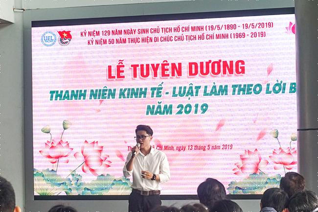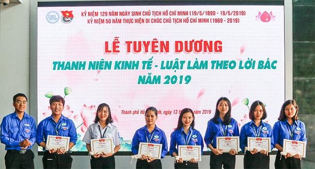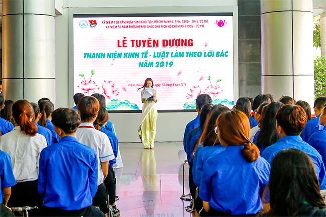 Chương trình lễ tuyên dương 84 gương Tiêu biểu thanh niên Kinh tế - Luật làm theo lời Bác, thuộc các lĩnh vực Học tập - NCKH, Công tác Đoàn - Hội và hoạt động Văn - Thể - Mỹ. Đồng thời khen tặng Gương điển hình tập thể làm theo lời Bác năm 2019 cho tập thể Đoàn khoa Kế toán - Kiểm toán.