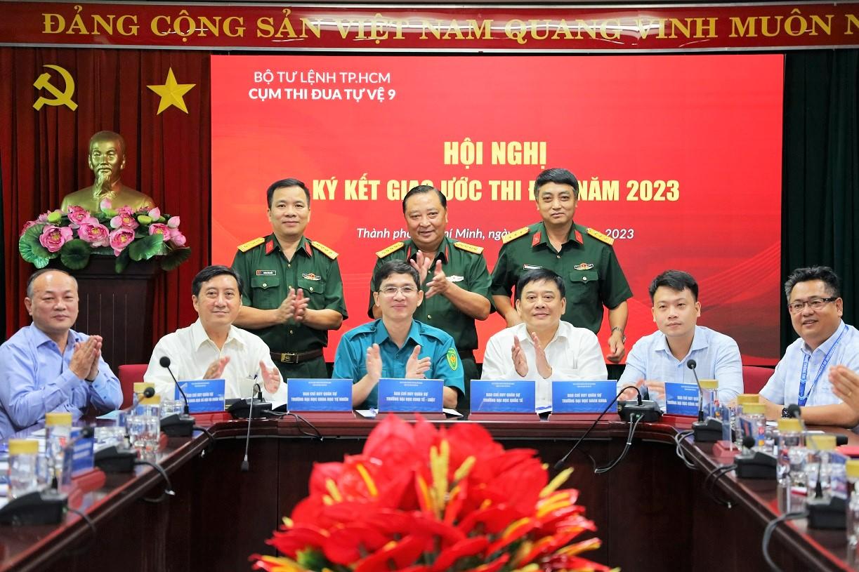 Tại Hội nghị ký kết, Cụm trưởng Cụm thi đua 9 đã thông qua dự thảo giao ước thi đua năm 2023 với chủ đề thi đua "Đoàn kết, mẫu mực, kỷ cương, sáng tạo, quyết thắng". Các nội dung thi đua bao gồm: Thi đua xây dựng đơn vị "Mẫu mực, tiêu biểu", hoàn thành xuất sắc nhiệm vụ; Đẩy mạnh đổi mới, sáng tạo, tiếp tục thực hiện thắng lợi nhiệm vụ quân sự, quốc phòng năm 2023; Đẩy mạnh thi đua thực hiện tốt các khâu đột phá. Theo đó, hệ thống chỉ tiêu phấn đấu của Cụm thi đua 9 trong năm 2023 tập trung vào những nội dung: (1) Công tác sẵn sàng chiến đấu, bảo vệ an toàn đơn vị, góp phần tích cực giữ gìn ANCT - TTATXH; (2) Công tác huấn luyện, giáo dục chính trị, pháp luật cho lực lượng tự vệ; (3) Tổ chức xây dựng lực lượng tự vệ; (4) Công tác huấn luyện quân sự, tham gia hội thao và diễn tập (5) Thực hiện chính sách hậu phương quân đội. Một số chỉ tiêu phấn đấu cụ thể được đề ra: Các đơn vị phấn đấu xây dựng từ 85% đến 100% văn kiện chiến đấu; Đảm bảo 100% an toàn cháy nổ và an ninh tại đơn vị; Đảm bảo 100% chiến sĩ được phổ biến Luật dân quân tự vệ; Xây dựng lực lượng tự vệ bảo đảm số, chất lượng đạt chỉ tiêu theo kế hoạch đề ra; Bảo đảm quân số tham gia huấn luyện đạt 100% theo kế hoạch huấn luyện của cấp trên; Các đơn vị bảo đảm quân số tham gia hội thi, hội thao từ 95% đến 100% theo kế hoạch của cấp trên; Tham gia tích cực các hoạt động "Đền ơn đáp nghĩa", xây dựng "Nhà tình nghĩa, nhà tình thương và sửa chữa nhà" và vận động ủng hộ các phong trào theo chủ trương Bộ Quốc phòng, Quân khu 7, Ban CHQS địa phương và kế hoạch của Bộ Tư lệnh Thành phố triển khai,…