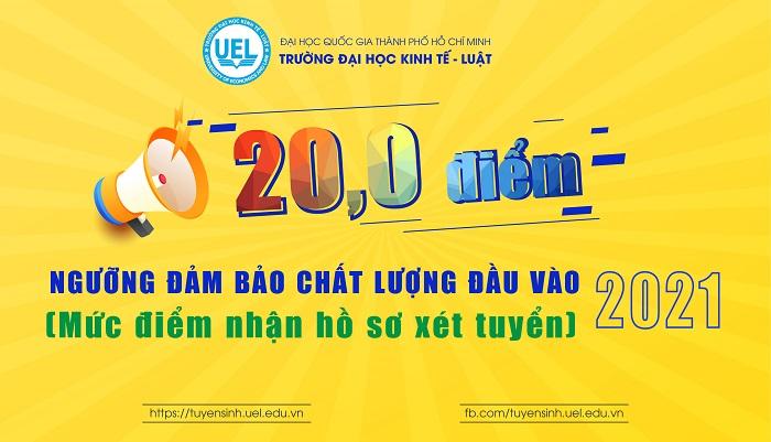 Tối ngày 17/8/2021, Trường Đại học Kinh tế - Luật, ĐHQG-HCM đã công bố ngưỡng đảm bảo chất lượng đầu vào, mức điểm nhận hồ sơ xét tuyển chương trình đào tạo đại học chính quy năm 2021 là 20,00 điểm (áp dụng cho phương thức 2, phương thức 3 của tất cả các ngành và tổ hợp xét tuyển).