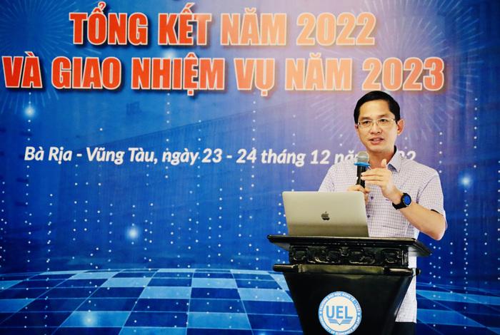 Trong "Báo cáo tổng kết 2022 và phương hướng, nhiệm vụ 2023" ThS Võ Văn Trọng - Trưởng phòng Hành chính đã nêu lên kết quả thực hiện nhiệm vụ thường xuyên, hệ thống tiêu chí cốt lõi đánh giá kết quả và các mảng công tác, phân tích kết quả hoạt động 2022 của Trường.